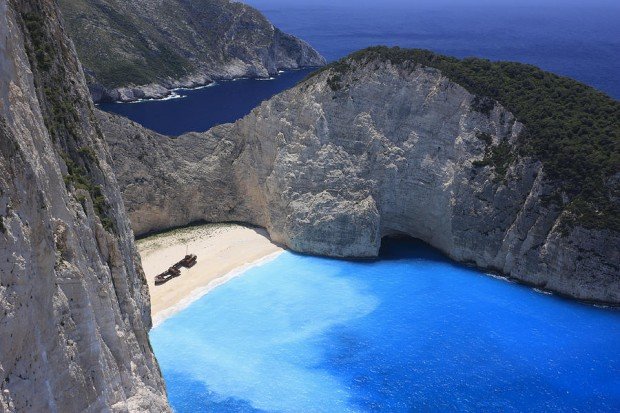 Navagio beach is an exposed, isolated cove, located on the north west shore of Zakynthos island and took its name from a smuggler shipwreck that was washed on shore in 1981, due to an engine malfunction and bad weather conditions. The small beach has amazing, white, soft sand and crystal clear waters and is defined by huge vertical limestone cliffs.