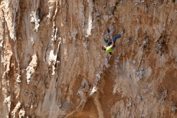 Grande Grotta is one of the most important crags on the island and is located within walking distance from Misouri village. This impressive rock is made out of top quality grey and yellow lime stone and offers three more different sections with a wide variety of routes that rate between 6a and 8a+. It’s top elevation is at 173 m/567.5 ft above sea level and it faces Northwest. All routes start from the “Afternoon” sector, a huge corner on the left side of the crag, with at least 20 routes for warm up. The views are breathtaking, while climbing higher, as you can see almost everything from up there and admire the bluest waters of the Aegean Sea.