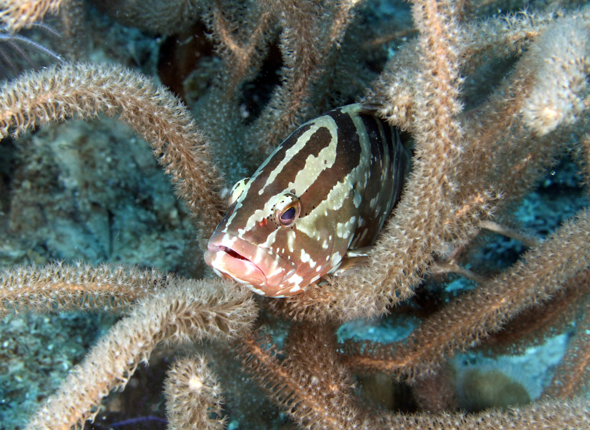 This lovely location offers good visibility that reaches 28-30 m/91.8-98.4 ft. The maximum depth is 30.5 m/100.1 ft and the water temperature varies between 24 °C/75.2 °F and 30 °C/86 °F. Grouper Hole accommodates both the beginner and more experienced diver. Last but not least, it is also great for night diving and macro photography.